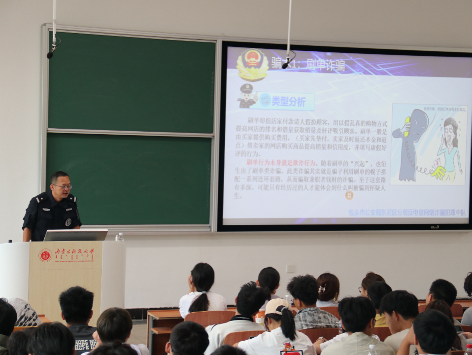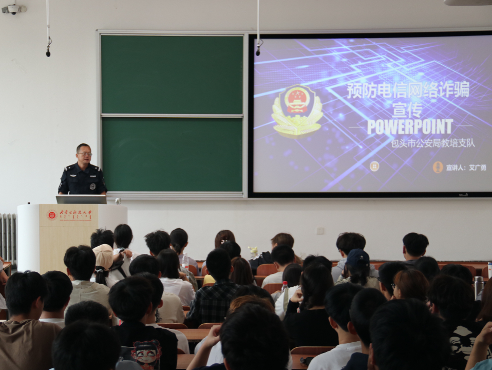 9月11日上午,在二教C103,包头市公安局针对2025级新生开展防诈骗、禁毒、国家安全;李淼老师在B102为新生主讲实验室安全。