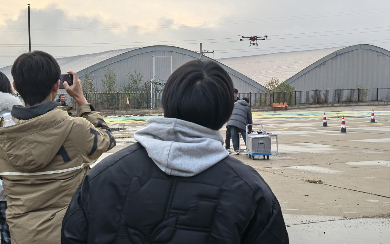 无人机如何与交通工程结合?在畅行数字科技集团,同学们找到了答案。企业专家展示了无人机在交通勘察、道路巡检、应急抢险中的丰富案例。在实操训练场,教员娴熟的飞行演示——起飞、悬停、航线飞行、精准降落——更是引来阵阵惊叹,生动揭示了“低空+交通”的无限潜力。