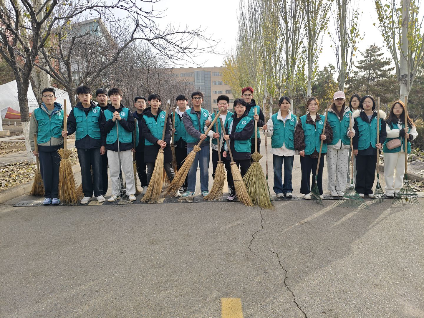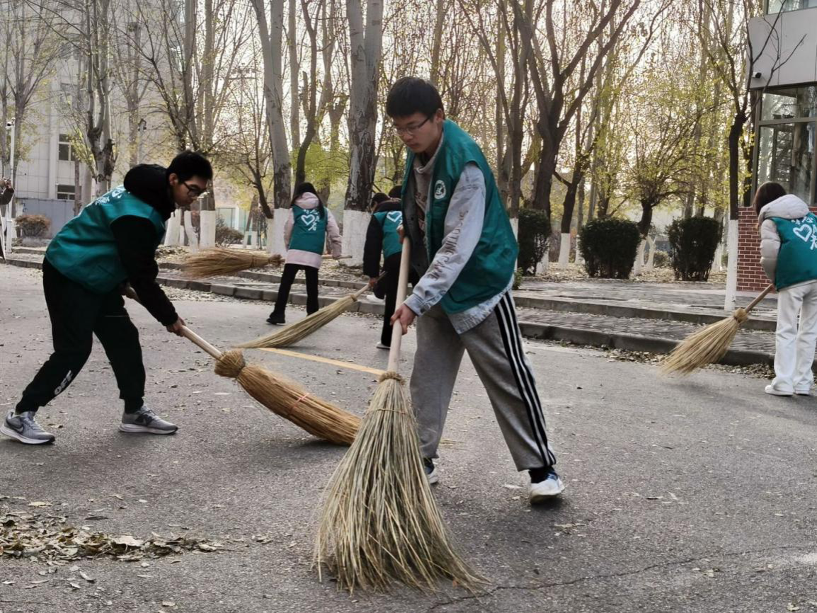 大家手持扫帚,默契配合,将散落各处的落叶一一归拢。尽管落叶量大,但同学们热情不减,忙碌的身影成为秋日校园里一道温暖的风景。