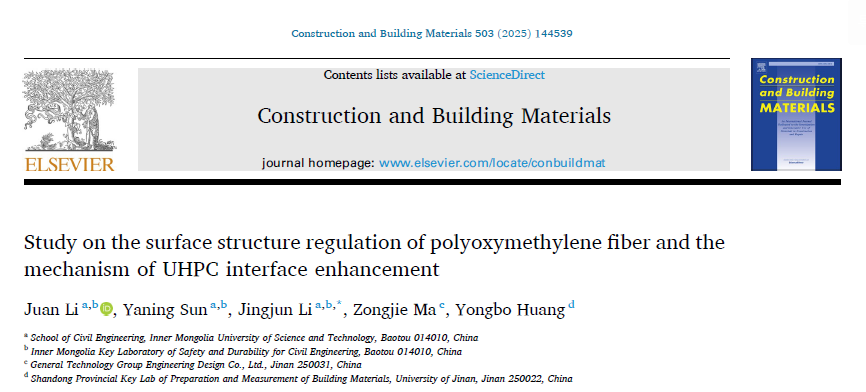 近日,明陞m88官方网站地址工业与城市固体废弃物建材资源化利用团队李娟副教授在Construction and Building Materials期刊(IF=8.0,中科院1TOP)发表题为“Study on the surface structure regulation of polyoxymethylene fiber and the mechanism of UHPC interface enhancement”(DOI: 10.1016/j.conbuildmat.2025.144539)的研究成果。该研究系统探究了纳米二氧化硅改性聚甲醛纤维对矿渣硫铝酸盐水泥基UHPC界面性能的调控机制,通过硝酸预处理与硅烷偶联剂(KH550KH560KH570)辅助的溶胶-凝胶法实现了纤维表面结构优化,结合拉拔试验、SEM/EDSAFMFTIR与接触角测试,系统分析了改性纤维的界面粘结行为与增强机理,揭示了表面粗糙度提升与化学键合增强对界面性能的协同作用,并验证了改性纤维在提升粘结强度与耗能方面的显著效果,同时论证了该体系在降低碳排放方面的可持续性优势。
