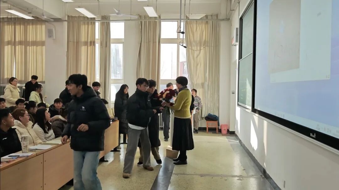 在鲜花致敬环节,员工与员工代表依次献花,表达对徐老师的感谢与祝福。徐伟老师手捧鲜花在感言中回顾了在校十六年的岁月,感谢学院与师生的支持,并表示将继续关注教育、助力青年员工成长。真挚的话语引来阵阵掌声,不少师生感动落泪。