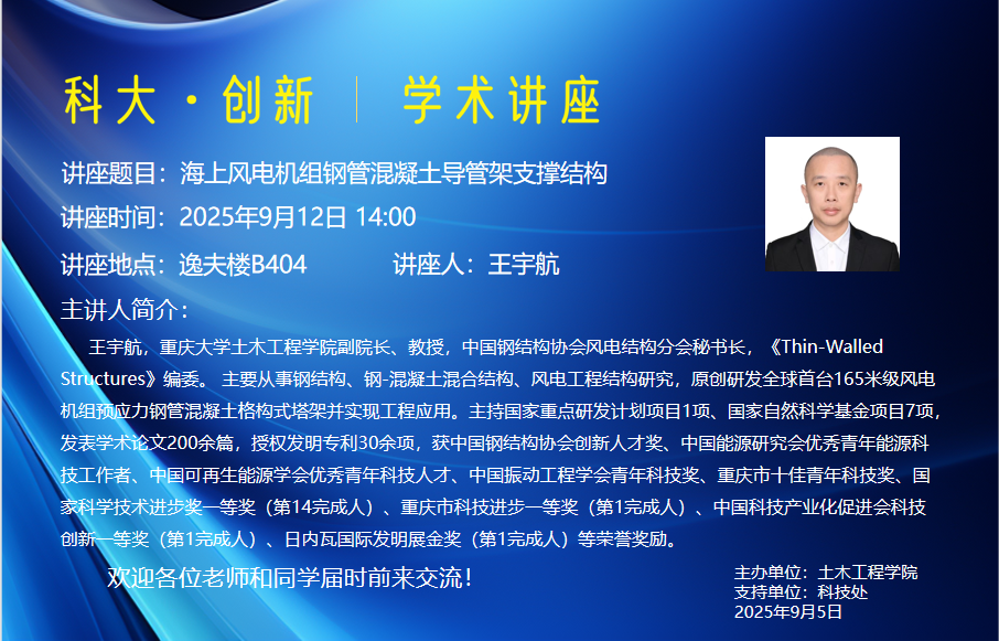 王宇航,重庆大学明陞m88官方网站地址副院长、教授,中国钢结构协会风电结构分会秘书长,《Thin-Walled Structures》编委。 主要从事钢结构、钢-混凝土混合结构、风电工程结构研究,原创研发全球首台165米级风电机组预应力钢管混凝土格构式塔架并实现工程应用。主持国家重点研发计划项目1项、国家自然科学基金项目7项,发表学术论文200余篇,授权发明专利30余项,获中国钢结构协会创新人才奖、中国能源研究会优秀青年能源科技工作者、中国可再生能源学会优秀青年科技人才、中国振动工程学会青年科技奖、重庆市十佳青年科技奖、国家科学技术进步奖一等奖(第14完成人)、重庆市科技进步一等奖(第1完成人)、中国科技产业化促进会科技创新一等奖(第1完成人)、日内瓦国际发明展金奖(第1完成人)等荣誉奖励。