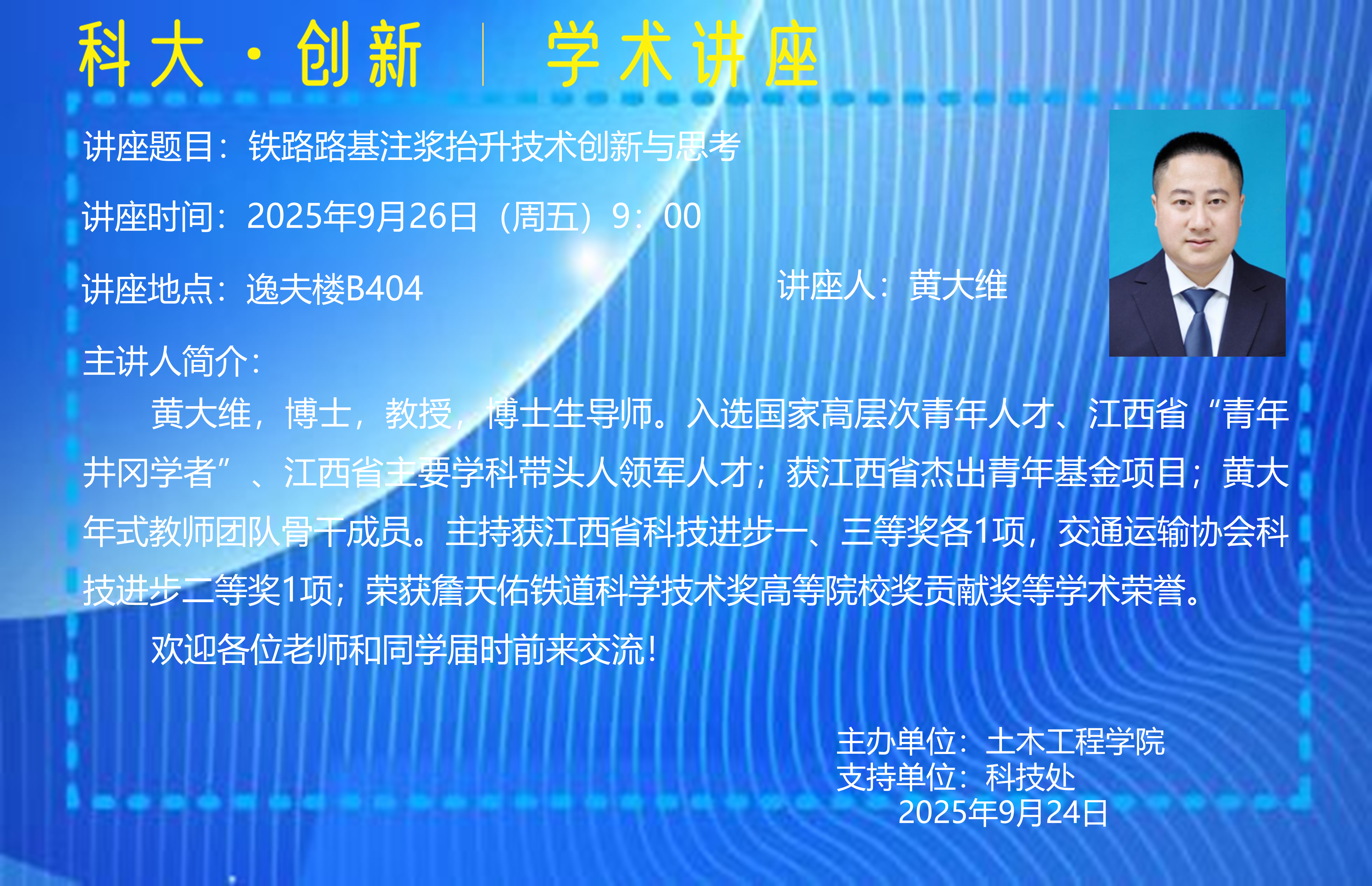 黄大维,博士,教授,博士生导师。入选国家高层次青年人才、江西省“青年井冈学者”、江西省主要学科带头人领军人才;获江西省杰出青年基金项目;黄大年式员工团队骨干成员。主持获江西省科技进步一、三等奖各1项,交通运输协会科技进步二等奖1项;荣获詹天佑铁道科学技术奖高等院校奖贡献奖等学术荣誉。