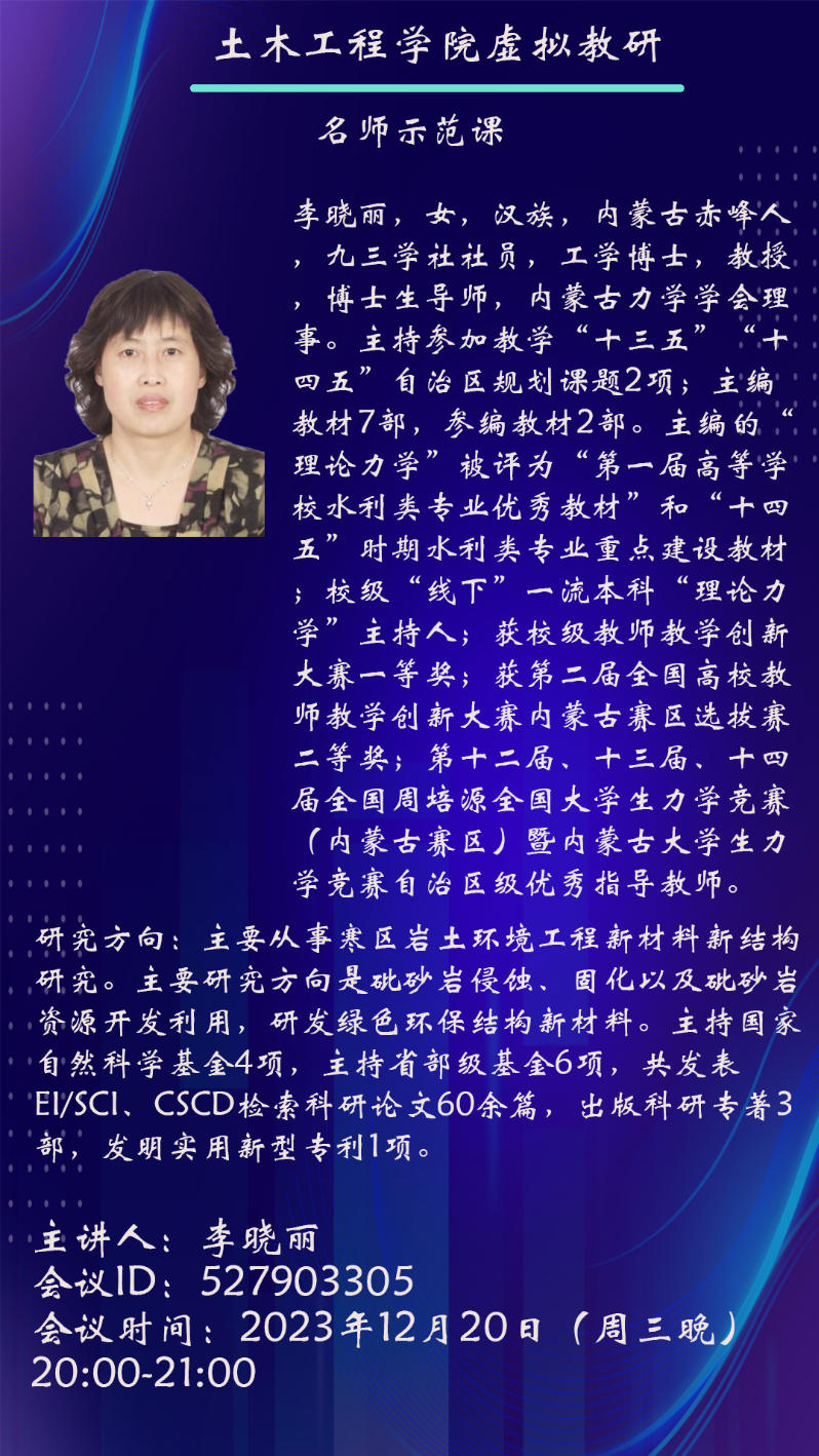 2023年12月20日晚,明陞m88官方网站地址虚拟教研室“名师示范课”系列第二场活动顺利举行。李晓丽教授以“力学教学创新与科研反哺课堂的探索与实践”为主题,通过腾讯会议平台带来了一场内容丰富、见解独到的教学盛宴,吸引了全国多所高校员工与研究生的积极参与。