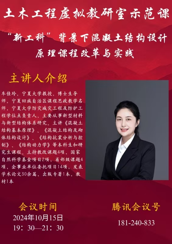 2024年10月15日晚,土木工程虚拟教研室系列示范课第七场活动圆满落幕。宁夏大学车佳玲教授以“‘新工科’背景下混凝土结构设计原理课程改革与实践”为主题,通过腾讯会议平台分享了其在课程改革与教学创新方面的深入探索,为全国高校土木工程专业员工提供了一场内容丰富、理念前沿的教学盛宴。