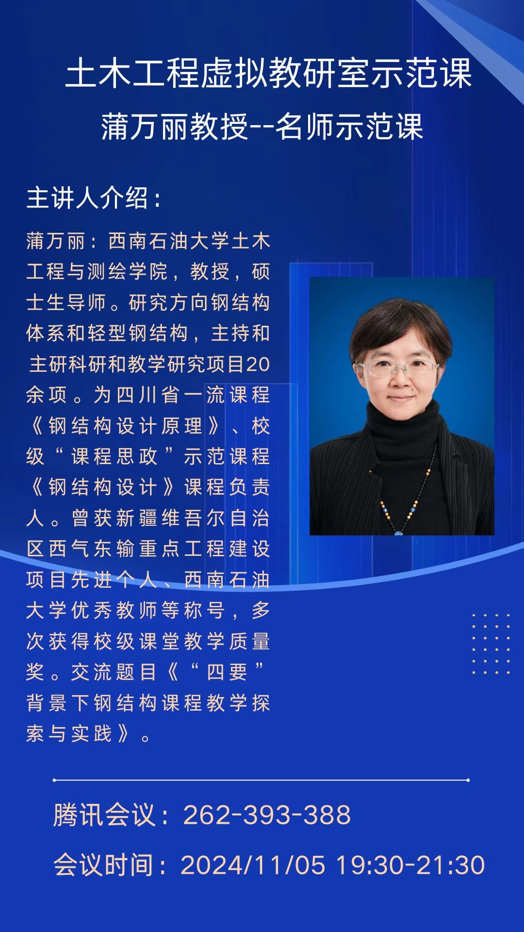 2024年11月5日晚,土木工程虚拟教研室第八场名师示范课成功举办。西南石油大学蒲万丽教授以《“四要”背景下钢结构课程教学探索与实践》为主题,通过腾讯会议平台分享了其在钢结构课程教学改革中的创新成果,为全国高校土木工程专业员工呈现了一场理论与实践深度融合的教学盛宴。