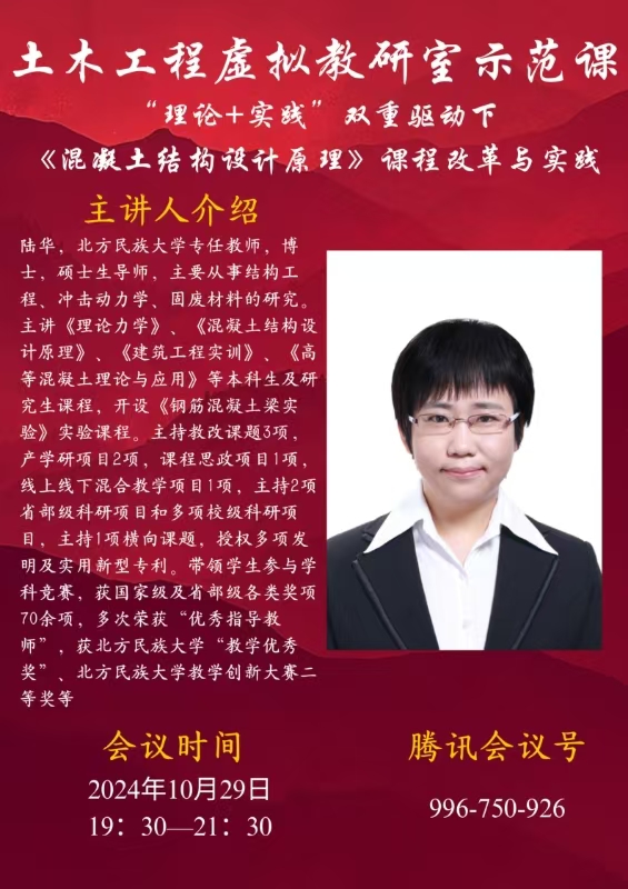 2024年10月29日晚,土木工程虚拟教研室第九场示范课成功落下帷幕。北方民族大学陆华博士以“‘理论+实践’双重驱动下《混凝土结构设计原理》课程改革与实践”为主题,通过腾讯会议平台分享了其富有创新性的教学改革成果,为全国高校同仁呈现了一场深度融合理论与实践的教学盛宴。