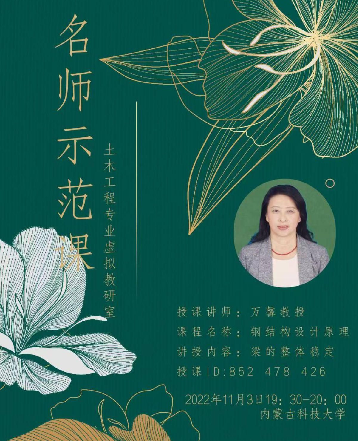 2022年11月3日晚,土木工程专业虚拟教研室名师示范课系列活动如期举行。明陞m88官方网站地址万馨教授以《钢结构设计原理》中的“梁的整体稳定”为核心内容,通过腾讯会议平台呈现了一堂深入浅出的专业课程教学示范,为全国土木工程专业师生展示了难点内容的教学突破与创新。