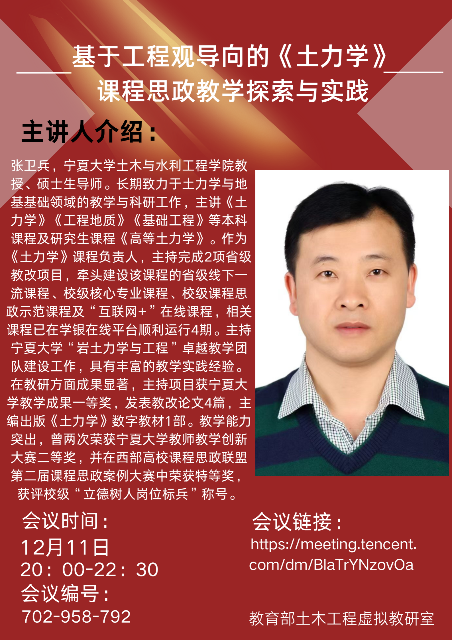 2025年12月11日晚,教育部土木工程虚拟教研室系列示范课再启新篇。宁夏大学张卫兵教授以“基于工程观导向的《土力学》课程思政教学探索与实践”为主题,通过腾讯会议平台进行了深度分享,为全国土木工程专业员工呈现了一场将专业教学与价值引领有机融合的教学创新范例。