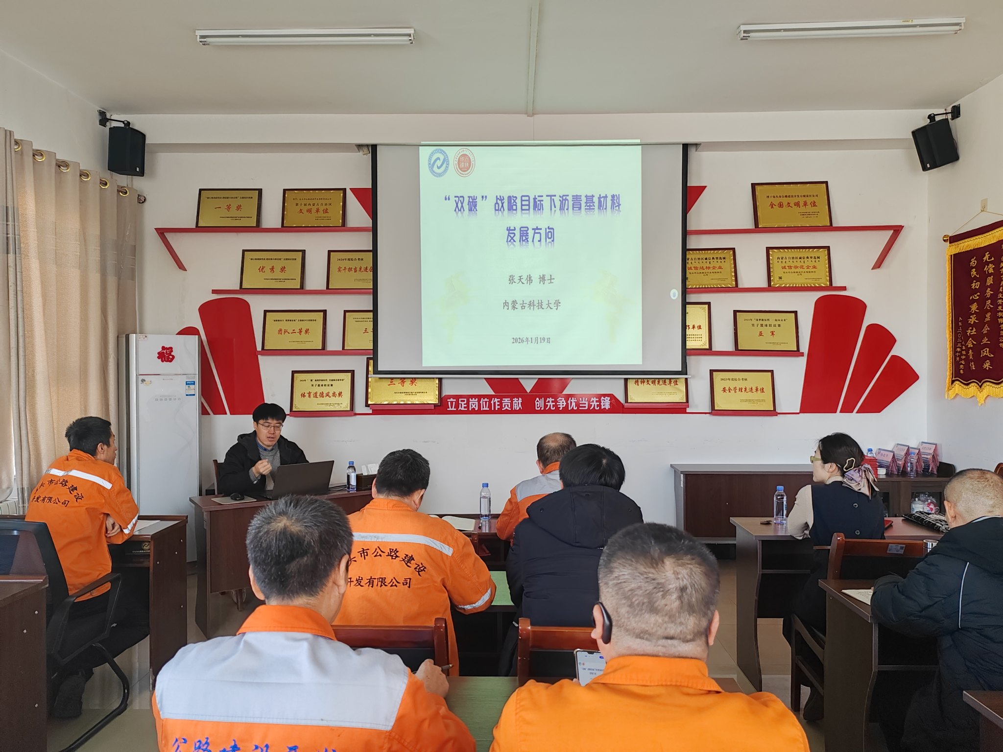 张天伟博士开展以“双碳战略目标下沥青基材料发展方向”为主题的技术交流讲座。此次交流活动聚焦石化和建材行业高碳排放问题,提出了“延寿减碳”与“再生循环”两大技术方向,系统阐述了沥青材料抗老化技术、自修复技术和再生利用技术等低碳化技术体系,为地区交通基础设施绿色转型提供了前沿思路和解决方案。